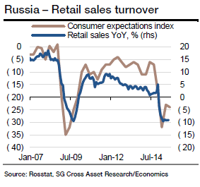 Therefore, the available leading indicators point to a continuing slack in retail sales on a seasonally-adjusted basis albeit at a slower pace than in the Q2 15 (-0.75% mom sa versus - 0.72% mom sa in August and -0.79% mom sa on average in Q2 15). Thus, the headline sales will likely fall by 1.0% mom with the annual gauge depressively low at -8.9% yoy, says Societe Generale.