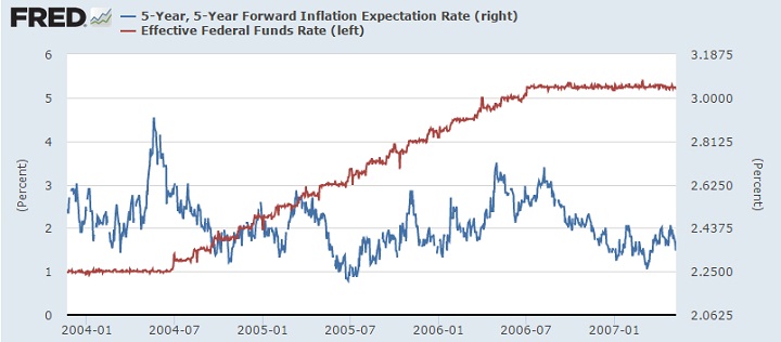 - Last time FED started hiking rates, was back in 2004, more than a decade ago. Inflation expectations were hovering around 2.59% as measured by 5y-5y forward inflation expectations and Federal fund rate was at 1% around. By July, 2006 effective FED funds rate reached 5.25% with inflation expectations hovering around 2.59%. The chart above explains the movement.