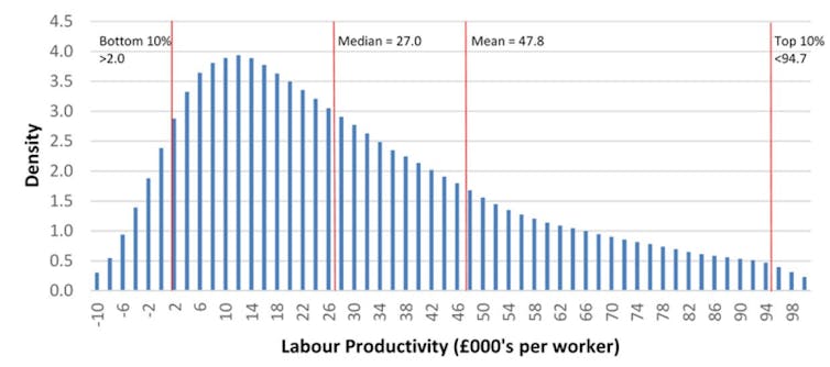 The top 25% of the UK’s most productive businesses are as much as five times more productive than businesses in the bottom 25%. One plausible explanation for this is that some businesses are quicker to adopt readily available technologies and better management practices, such as greater employee involvement.