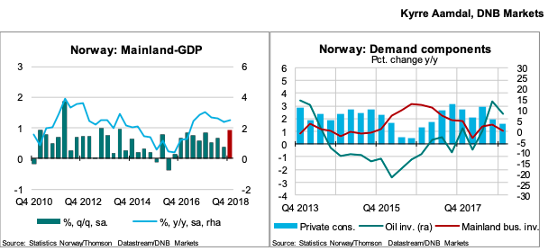 Mainland Norway’s GDP increased by 0.9 percent from Q3 to Q4 2018. Norges Bank projected 0.7 percent in its December-MPR. Consensus (Bloomberg) expected 0.8 percent; growth in Q3 was revised up from 0.3 percent to 0.4 percent.