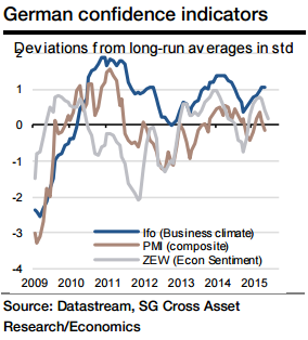 "As in other surveys, we expect expectations to weaken more than current conditions, due to concerns over Greece and financial market volatility.",says Societe Generale.