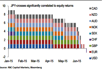 USD/JPY is expected to make more new highs in Q3 and JPY's apparent loss of safe-haven status removes another obstacle to this happening. In the latest three months there were no JPY crosses significantly correlated to equity returns except CHF/JPY and in that case, JPY is trading as the risky asset and CHF the safe haven.