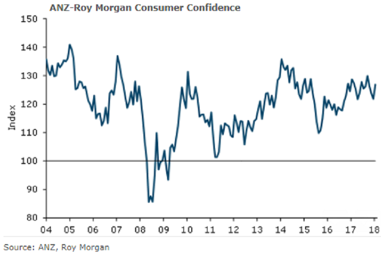 New Zealand’s ANZ-Roy Morgan Consumer Confidence Index lifted from 121.8 to 126.9 in January. This is still 3 points off the September high but is a pretty robust level. The Current Conditions Index rose a hefty 8.1 points to 131.3, its highest level since 2007.