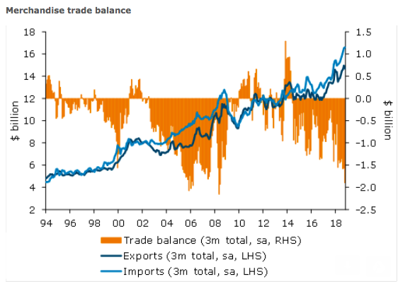 New Zealand’s monthly goods deficit was the third largest on record when excluding large items (aircraft), surpassed only by the previous two months. The annual deficit is now the highest in 11 years.