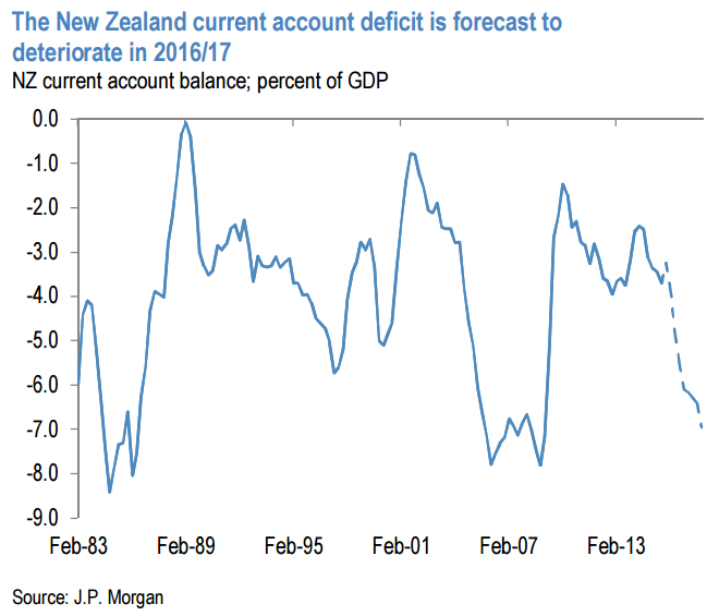 In 2016/17 return is expected to the bad old days of large current account deficits, which will be a headwind to NZD even if the RBNZ have reached the trough for the monetary policy cycle. Maintenance of solid domestic demand growth amid housing exuberance and trade drags should see the current account deficit position widen materially, to near 7% of GDP. Of most concern is that this will likely occur in an environment of rising US rates, which should throw a harsher spotlight on economies with external imbalances and dwindling relative yield compensation.