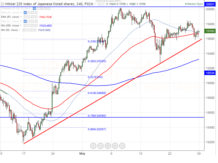 - Nikkei index is trading in narrow range between 1998 and 19277 for the past three weeks. It was consolidating in narrow range between 19847 and 19579 in the previous week on account of range bound yen. The index is trading around 19646 0.17% lower.