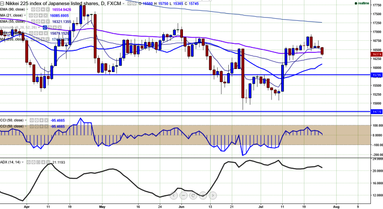 - Nikkei225 has broken major support 16430 and declined till 16334 at the time of writing on the account of stronger yen.It is currently trading around 16354.