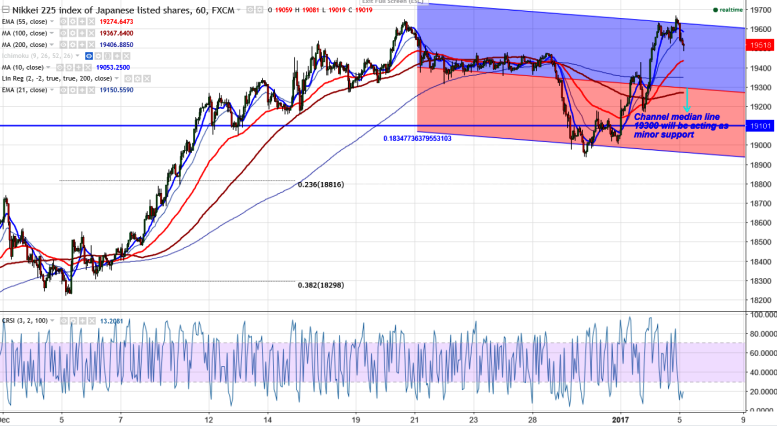 Nikkei225 broken the previous high of 19653 and jumped slightly from that level. The slight recovery in yen has dragged the price down from the high of 19673. It is currently trading around 19498 0.64% lower.