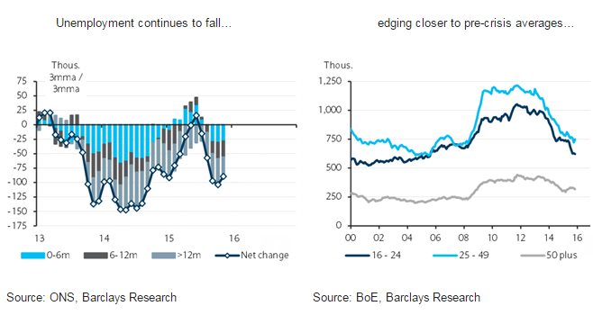 "Overall, the current environment underscores our view that a hike in Bank Rate will be pushed out to Q4 16. Further, with yesterday's weaker-than-expected CPI print and today's continued weakness in wage growth, it only underscores the cautious comments made by Ian McCafferty, that the pick-up in domestic inflationary pressures is going to be later and slower than the Committee had previously thought." said Barclays Capital in e report.