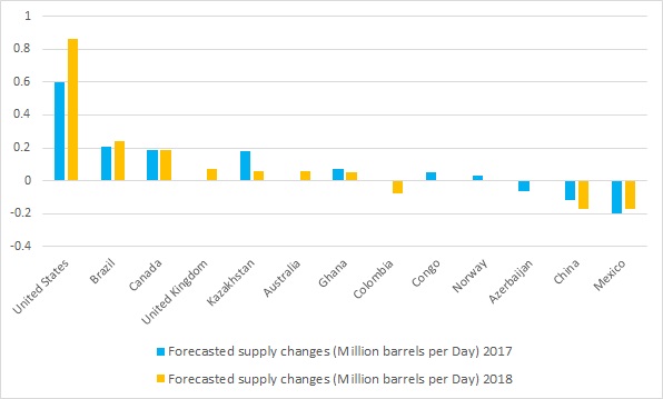 The chart shows, non-OPEC supply forecast for 2017 and 2018. Supplies from the United States are expected to rise by 0.6 million barrels per day in 2017 and by 0.86 million barrels per day in 2018. Overall in 2017, the oil supplies are expected to rise by 0.95 million barrels per day and in 2018, it is expected to rise by 1.11 million barrels per day.