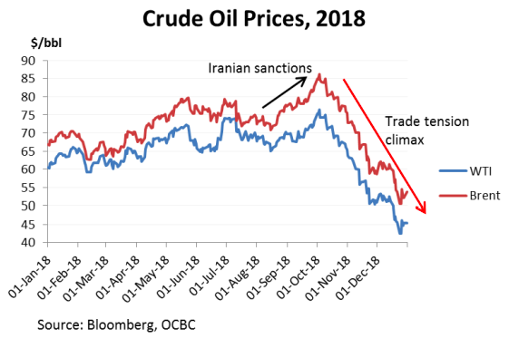 "In 1H2019, we expect oil prices to remain subdued due to an overhang of bearish factors, including the bleak economic backdrop and the triple threat of trade tensions, US government shutdown and Brexit," the report commented