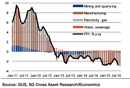 "Downward pressure on commodities and global oil markets is still significant which should mean the PPI will remain below zero until end-2015", says Societe Generale.