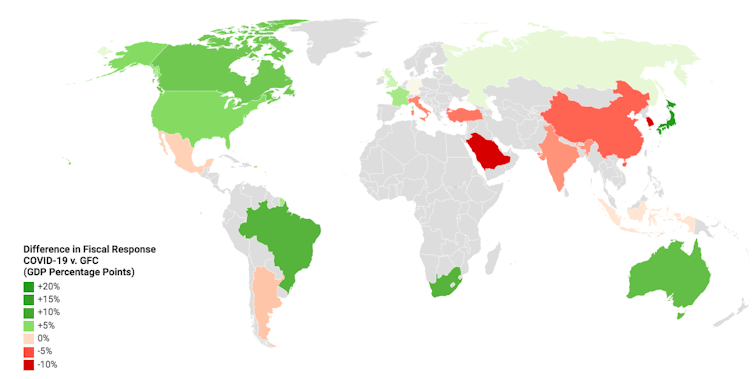 The Center for Strategic and International Studies estimates that the G20 had deployed US$7 trillion (£6.2 trillion) in direct spending, tax relief and lending by the end of May. That is more than 10% of their combined GDP for 2019, averaging over 12% among the advanced economies. This exceeds the fiscal support measures taken by governments during the great financial crisis of 2007-09, as can be seen in the map below.