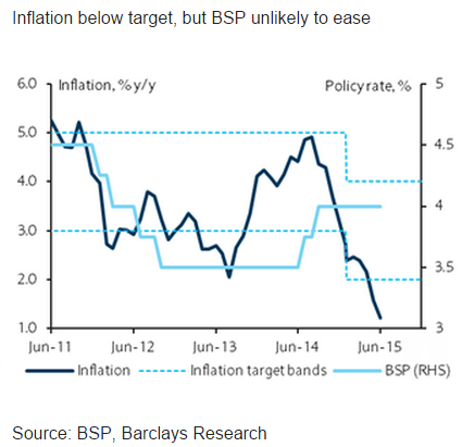 BSP comfortable with policy stance for now. In comments after the release, BSP Governor Tetangco reiterated his concern over risks from El Niño (and added Greece) and said BSP would "monitor if there is a need to adjust policy", similar to comments after last month's inflation print. A prolonged period of below-target inflation could raise risks of a one-off cut, though the BSP appears comfortable with its stance for now.