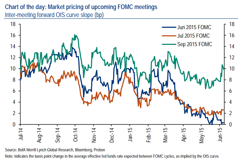 This likely reflects lingering uncertainty about the prospects for a growth rebound after a disappointing start to the year. However, our 2Q GDP tracking model now stands at 2.9%, as Ethan Harris notes. With growth picking up, Sept remains our base case for the first Fed hike, a view that was affirmed by the latest employment report. In light of this, we reiterate our Aug-Oct 2015 forward OIS curve steepener recommendation (11 bp), which we continue to see as a cheap way to position for a Sept rate hike, said BofA Merrill Lynch in a report