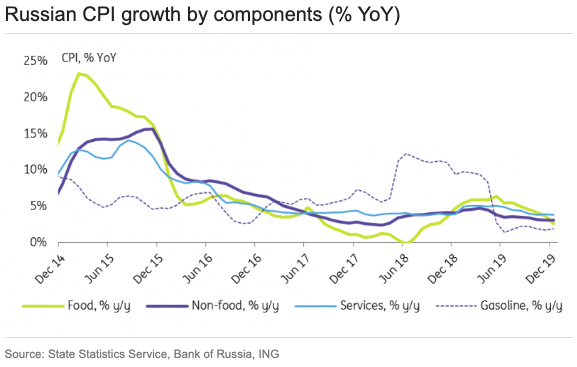 Russia ended 2019 on a disappointing note in terms of consumer price inflation (CPI), which dropped to 3 percent y/y, close to the Central Bank of Russia’s (CBR) lower target range and is expected to fall nearly to 2 percent on a temporary basis during the first quarter of this year, according to the latest research report from ING Economics.