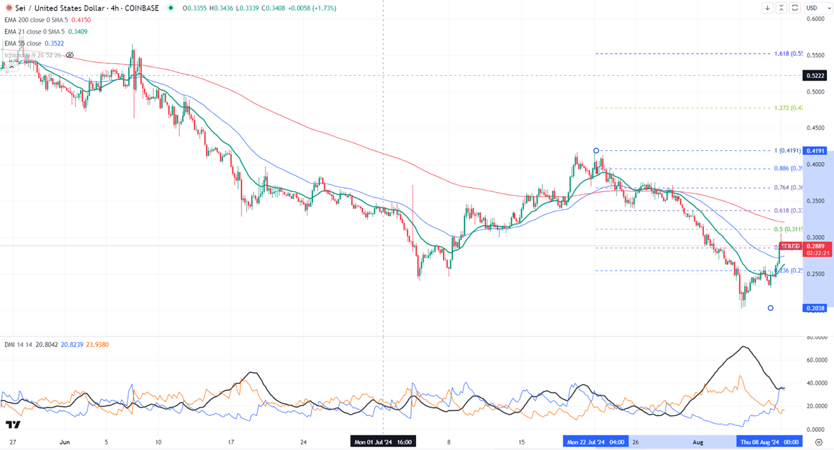 TIAUSD gained more than 50% in the past two days. The pair holds well above the short-term (21 and 55 EMA) and below the long-term moving average. It hit a high of $0.306 and is currently trading around $0.2905.