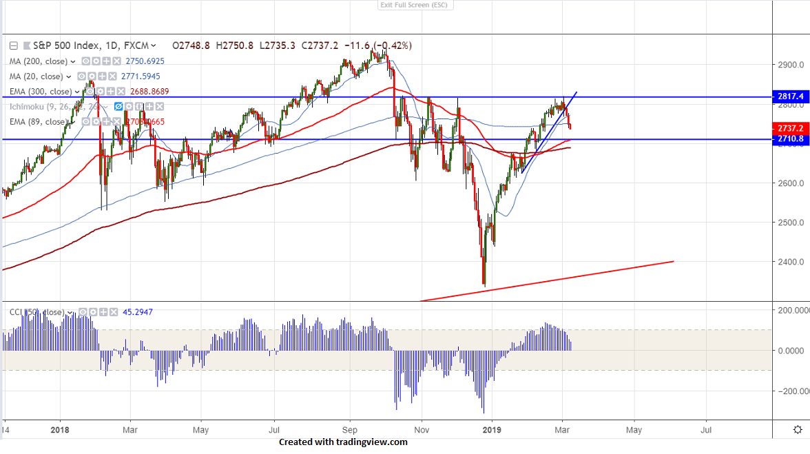 S&P500 trades weak for 5th consecutive after a continuous jump for past more than 2- month. The index recovered more than 20% from low of 2334 level on account of easing trade tensions between US-China. It has lost more than 80 points from high and is trading slightly below 200- day MA.It hits low of 2735 and is currently trading around 2740.