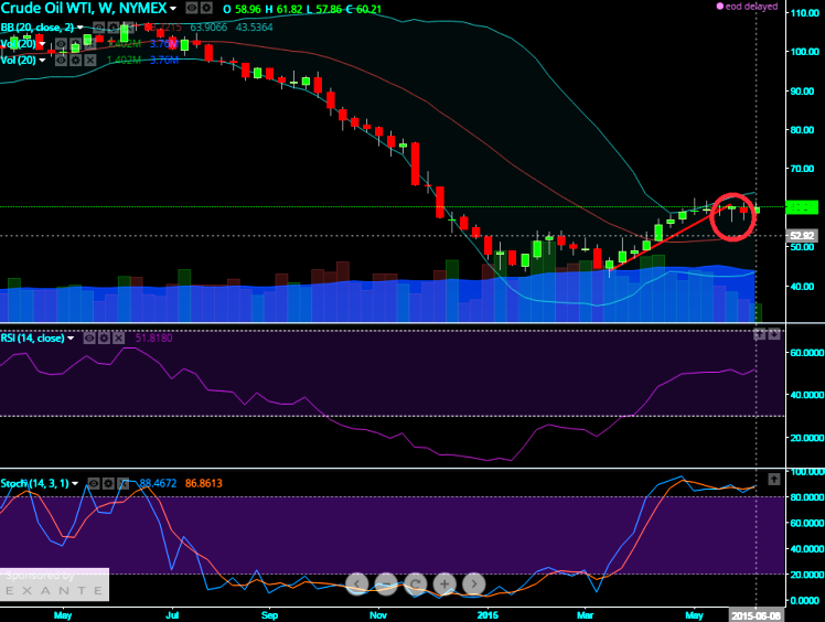 When we plot charts of CL1 futures on weekly basis, it was spotted out the breach of trend line support at 60.41 levels & hanging man candlestick pattern at the same levels followed by the context of the spinning top pattern as well that formed early June.