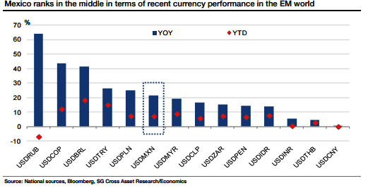Also, Mexico's trade and financial openness, recent reforms, relatively better growth outlook and sound monetary policy achievements also seem to have been largely ignored, says Societe Generale.