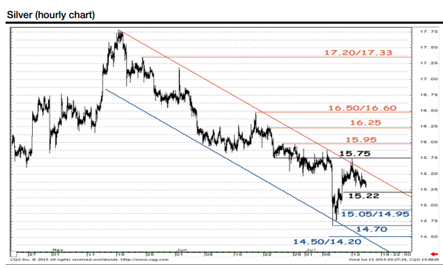 Silver approached near last December lows of 14.50 which also represents the down sloping channel since early January and the steeper one in force since May. Currently, Silver is probing the steep channel upper limit at15.75, a break above is needed to prompt positive signals, in which case a larger rebound would unfold towards 16.50 with intermittent resistances at 15.95 and 16.25
