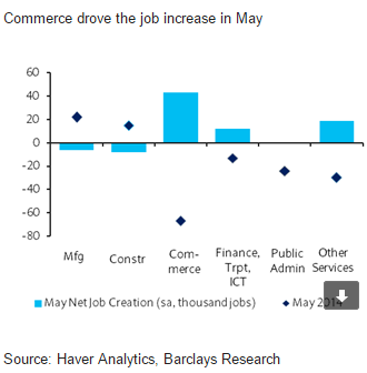 - Looking ahead, we continue to expect new launches over the summer from the auto sector and mobile devices to revive the pace of factory hiring in the coming months. Elsewhere, public administration remained flat in May, while agriculture shed jobs (-5k; April: -47k; Mar: +36k).