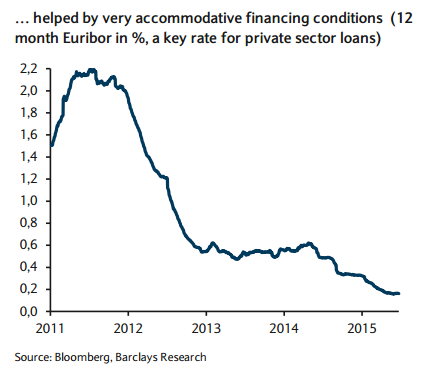 The average interest rate on public debt issued by Treasury in 2015 is 0.9% - the lowest on record. More important, the very accommodative ECB monetary policy stance is expected to continue to support extraordinarily low financing costs for the private sector. The 12-month Euribor, the key rate for (almost) all Spanish mortgages, has averaged YTD 20bp (some 200bp lower than the 2012 peak-crisis level) and is unlikely to materially increase in 2015-16 as the liquidity surplus in the EA is expected to remain ample under the ECB's QE programme.