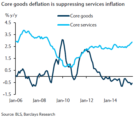 "We expect further pass-through from dollar appreciation to weigh on core goods prices through mid-2016. Renewed strength in the dollar since mid-year, particularly against EM currencies, and an accelerated decline in China PPI lead us to project a modest softening in core inflation in the months ahead - a factor which informs our believe that the Fed will execute three additional rate increases in 2016 instead of the expected four", says Barclays in a research note.
