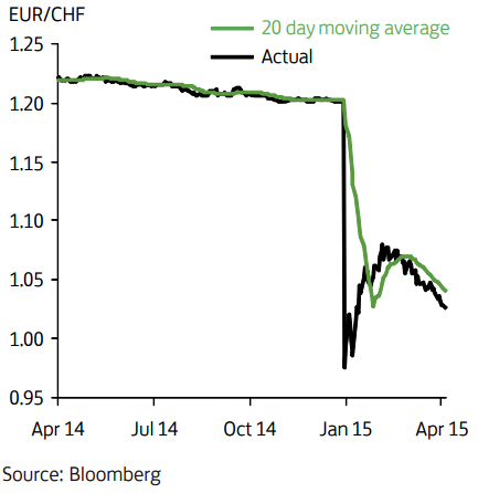 The Swiss franc briefly strengthened through 0.95 against the USD earlier this month after a disappointing US March payrolls report triggered broad-based selling of the USD.