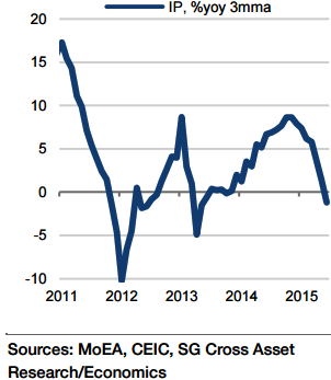 "Industrial production likely continued to suffer from weak external demand and looks set to have decelerated further to -1.6% yoy in July from -1.4% yoy in June", says Societe Generale.