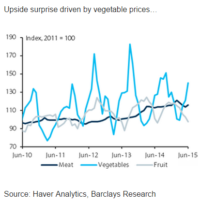 "We recently lowered our 2015 inflation forecast by 40bp, to -0.10%, as we expect oil distortion to extend into H2, albeit with a smaller drag, given that international oil prices have stayed rangebound. We maintain our 2016 inflation forecast at 2.1%, on account of a low base and subsequent pickup in oil prices",says Barclays.