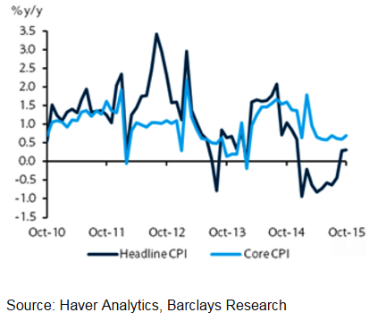 "2015 inflation is forecast to -0.2% y/y. The 2016 inflation forecast is unchanged at 1.7% y/y. Overall, the miss was driven by still elevated food prices, as we had expected food inflation pressure to subside more quickly", added Barclays.