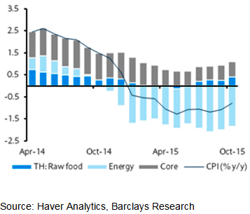 "The CPI inflation is likely to remain in negative territory through 2015 and rise very gradually in 2016. 2015 inflation is forecasted to -0.8%, and the risks are still biased to the downside. 2016 inflation id forecasted at 2.0%, with risks clearly tilted to the downside", says Barclays.