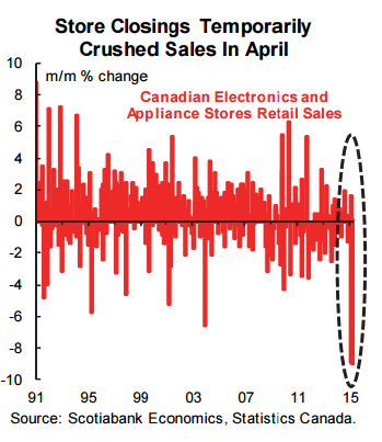 After all the excitement of the past week, Canadian market participants get a breather this coming week. Retail sales will be the lone macro release. Store closings have been temporarily fouling up the Canadian retail sales figures of late. That's one reason why it's premature to write off the consumer in Q2. Recall that sales fell slightly by 0.1% m/m in April, coming in well below consensus expectations for a gain of 0.7% m/m that had been based upon what was known ahead of time for some of the components. Also recall, however, that Future Shop announced that it was closing 131 of its Canadian stores with only half reopening the next week as Best Buy outlets. That probably explained the nearly 9% monthly drop in sales at electronics and appliance stores. Also recall that Target had been in a prolonged withdrawal from Canada following a failed international expansion effort. Controlling for this effect is more difficult because of the categories that may have been affected, and the multi-month liquidation of assets. Because the role of store closings may have just been a one-off adjustment, we might see a rebound in the May report. It's not clear that store closings represent a sustained negative signal for overall spending or a compositional shift as people possibly spend more on-line, at other new outlets, or on new products (e.g., photo memory cards versus prints).