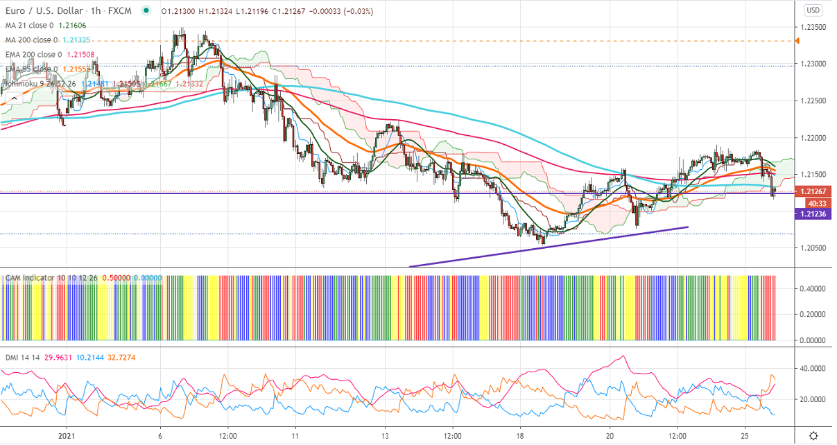 EURUSD declined more than 50 pips on weak German IFO business climate. The business climate declined to 90 in Jan compared to a forecast of 91.10. The surge in coronavirus cases and slight pessimism in Biden stimulus is supporting demand for safe-haven assets like yen. The pair hits an intraday low of 1.21160 and is currently trading around 1.21258.