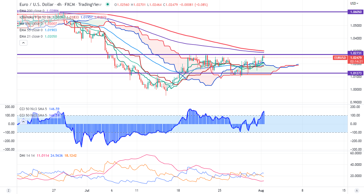 EURUSD is trading in a narrow range between 1.02780 and 1.01075 for the past week despite the weak US dollar. The pair gained slightly on Friday after a minor uptick in Eurozone CPI data. The yearly inflation came at 8.9 in Jul compared to a forecast of 8.7%. The US 10-year yield was one of the worst performers the previous month and lost more than 12% due to a dovish rate hike. Markets eye the US ISM manufacturing index today for direction. It hits an intraday high of 1.02701 and is currently trading around 1.02486.