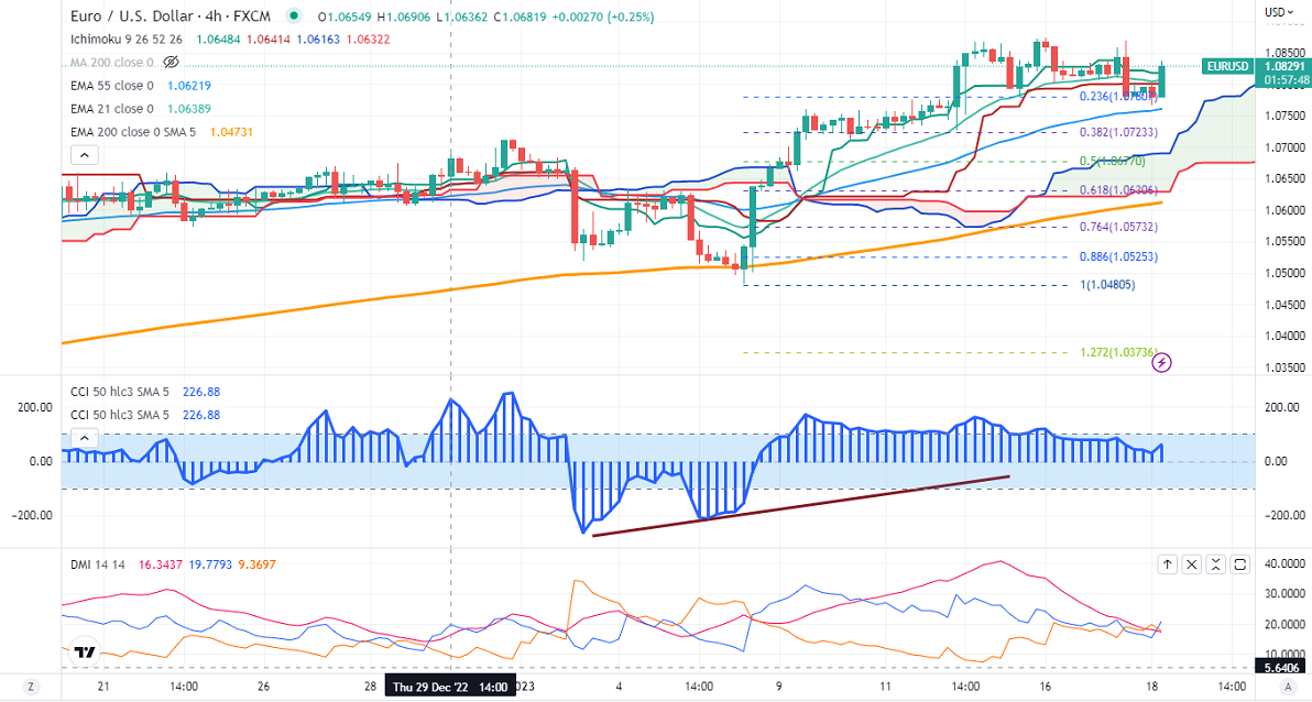 The pair is trading above short-term (21 and 55 EMA) and long-term (200-EMA) in the 4-hour chart. Any break above 1.08750 confirms minor bullishness, with a jump till 1.0925/1.09500/1.100 likely. The near-term support is around 1.07600. The breach below will drag the pair down to 1.0700/1.0660/1.0600.
