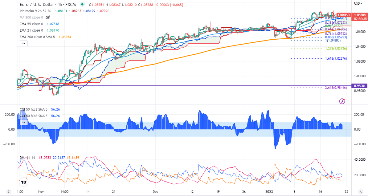 The pair is trading above short-term (21 and 55 EMA) and long-term (200-EMA) in the 4-hour chart. Any break above 1.0850 confirms intraday bullishness, with a jump till 1.08875 (Jan 18th, 2023 high)/1.0925/1.09500/1.100 likely. The near-term support is around 1.07600. The breach below will drag the pair down to 1.0700/1.0660/1.0600.