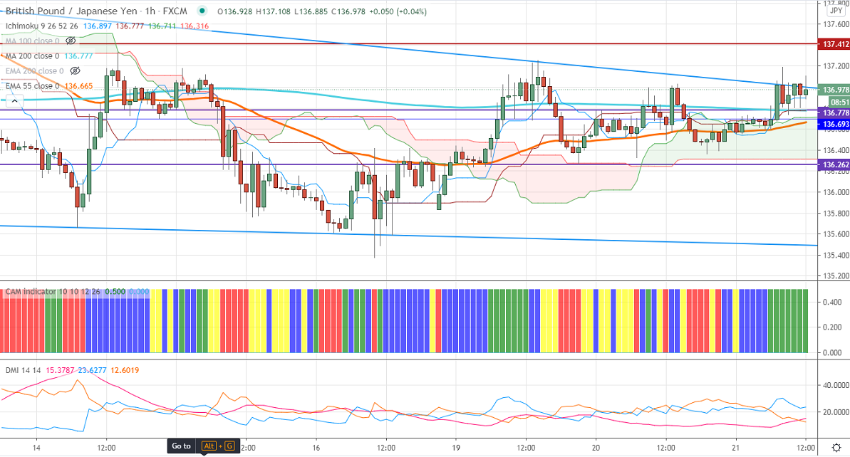 GBPJPY is consolidating in a narrow range between 137.23 and 136.50 for the past two days. The surge in pound sterling against USD on broad-based US dollar selling due to stimulus optimism. The strength in the yen is preventing the pair break above the 137.25 level. USDJPY is trading extremely weak, a break below 104.60 will open doors for further bearishness. The intraday trend of GBPJPY is slightly bullish as long as support 136.20 holds.