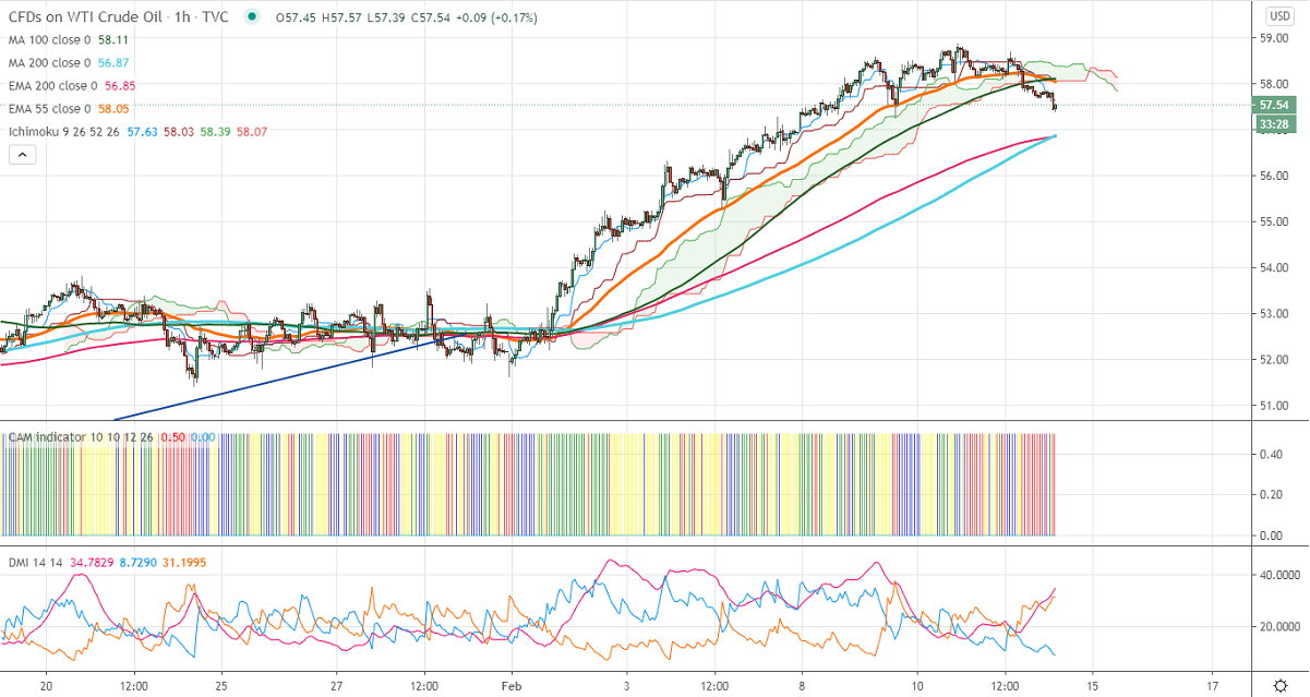 In the hourly chart, US oil is trading well below the long-term moving average (100 MA) and Tenken-Sen, Kijun-Sen. Any break below $56.85 (200- MA) confirms bearish continuation, a decline till $55 is possible. On the higher side, near term intraday resistance is around $58.11 and any indicative break below that level will take the pair to $58.88/$60.