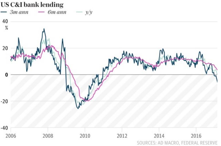 US bank lending has shifted surprisingly to the downside now that Trump Trade is losing momentum with markets. This has many analysts and credit strategists deeply concerned. With bank lending now heading south, this may dovetail with a contraction in overall economic activity in the world’s dominant economies – China and the US. At the start of the year, Wall Street was ebullient. The Dow Jones Industrial Average shattered records as it ascended the 20,000 level. The NASDAQ composite index and the S&P 500 index moved sharply higher as overall investor confidence in the US economy grew. The prospect of a Trump presidency in full flight is perceived as bullish for Wall Street. Deregulation, decreased taxation, increased protection for US industry, a replacement for current costly healthcare premiums were but a few of the many promises made by Team Trump.