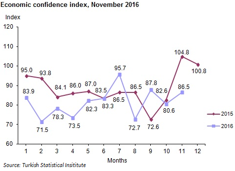 Turkey’s economic sentiment index rose in November from the previous month, according to Turkish Statistical Institute. The index was up 7.4 percent month-on-month, rising to 86.55 in November from 80.56 in October. The rise in the economic confidence index was driven by the rises in real sector and services sentiment indices.