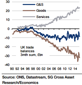 "Accordingly, with little change expected in the oil balance, we expect the overall trade deficit to increase to £2100mn", says Societe Generale.