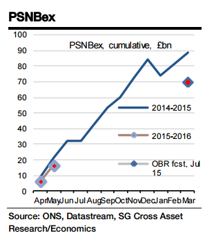 "We expect an improvement of £1.5bn in the June data which would result in a PSNBex figure of £8.9bn," said Societe Generale in a report on Monday.