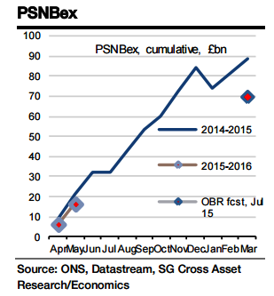 The latest OBR forecast for the full fiscal year deficit is £69.5bn. That implies a rate of improvement compared to last year of £1.2bn per month in the remaining ten months of the fiscal year, compared to the £2.5bn per month in the first two months.