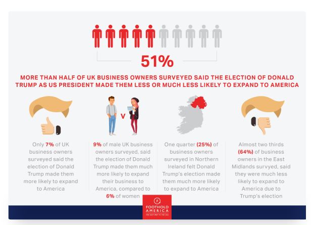 The success of business in America is no secret, however that doesn’t mean there aren’t factors that stand in the way of making it a desirable location for some. One of the most prominent stats to come from this survey was that 51% of UK business owners surveyed said that the election of Donald Trump as US president would make them less or much less likely to expand their business to America.