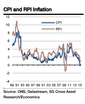 "We predict that goods inflation will stay at -1.2% yoy as the downward pressure from the strong pound continues but services inflation should increase slightly from 2.3% to 2.4% as the tightening labour market starts to have an impact," says Societe Generale.