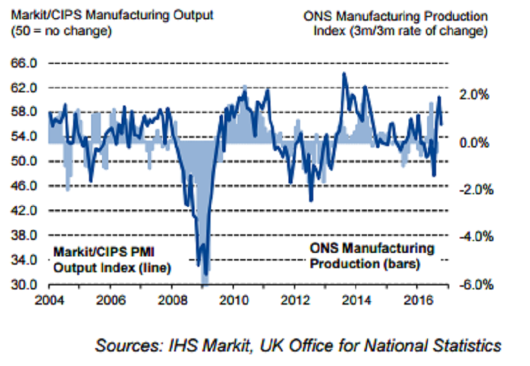 The strongest performing sub-sector was intermediate goods, which saw production rise at the quickest pace in a year. Output also continued to increase sharply at consumer and investment goods producers, albeit at markedly slower rates than in September.