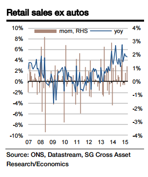 The CBI survey showed an enormous jump in the balance of reported sales from 12 to 51 in May and the BRC survey, using the BRC shop price index to create a real sales series, showed growth of 3% yoy after only 0.5% in April.