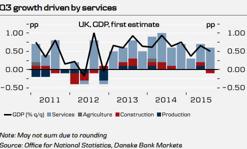 "This implies GDP in Q3 15 was 2.3% higher than in Q3 14 and 6.4% higher than the pre-crisis peak in Q1 08. Although growth slowed, it is still at trend and the economic upturn in the UK remains on track", says Danske Bank.